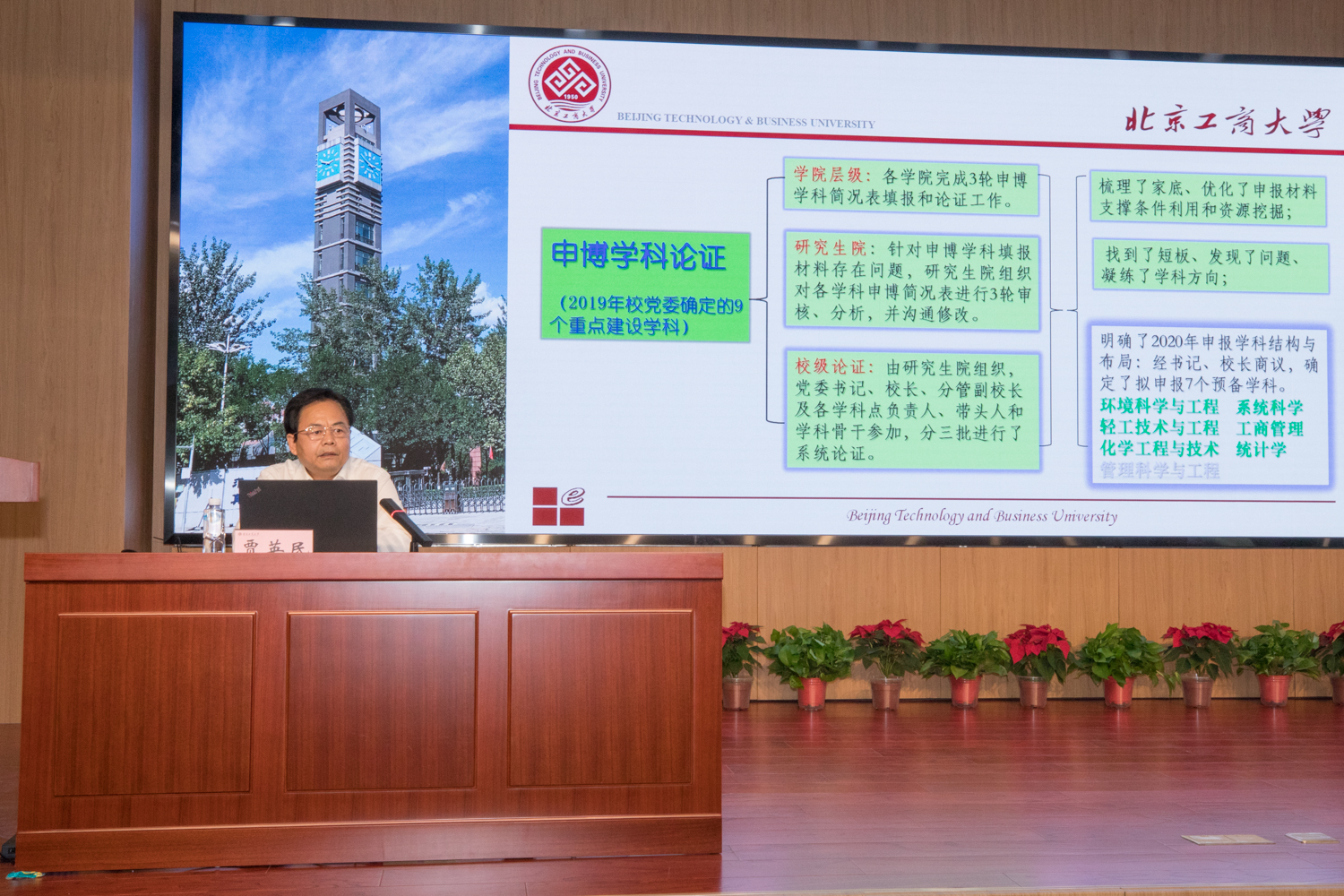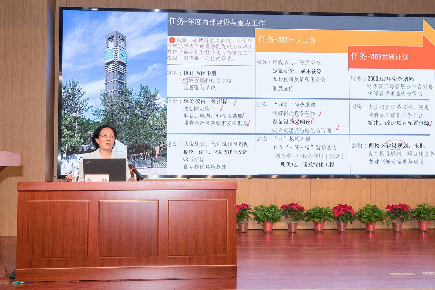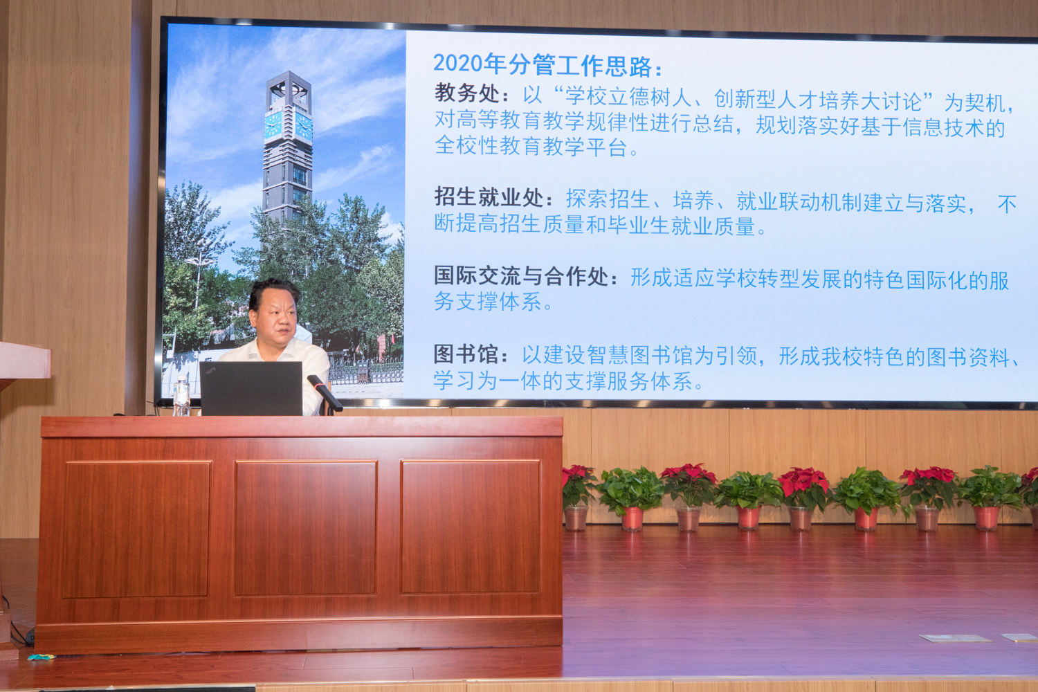 孫寶國校長回顧總結(jié)了上半年在黨中央和市委市政府的堅強領導下,全體北工商師生員工眾志成城、齊心協(xié)力抗擊新冠肺炎疫情,穩(wěn)步推進各項工作取得的突出成效:一是疫情防控工作取得階段性勝利,全體師生員工零感染;二是多措并舉確保線上教學有序運行,圓滿完成了上學期的教學任務;三是“以學生為本”,高效、周到完成畢業(yè)生畢業(yè)離校工作,教職工親手打包3萬余件行李并完成寄送,感動師生,引起社會良好反響;四是在做好疫情防控工作前提下,采取有效措施確保良鄉(xiāng)校區(qū)二期建設和阜成路校區(qū)環(huán)境提升工程按期按計劃完成,為新學期開學做好條件保障。孫寶國校長重點解讀了北京市分類辦學高水平研究型大學績效考核標準,深刻剖析了學校在人才培養(yǎng)、學科建設、科學研究等方面存在的差距,要求全體教職工統(tǒng)一思想、統(tǒng)一認識、統(tǒng)一行動,圍繞建設高水平研究型大學一條主線,堅定不移地走內(nèi)涵式高質(zhì)量發(fā)展道路。孫寶國校長強調(diào),要找準與兄弟院校差距,補齊各領域短板,確立目標找準發(fā)力點,持續(xù)推進“369”和“421”等標志性指標,勇攀人才培養(yǎng)質(zhì)量、本科生深造數(shù)量、學科建設水平、科學研究質(zhì)量高峰。