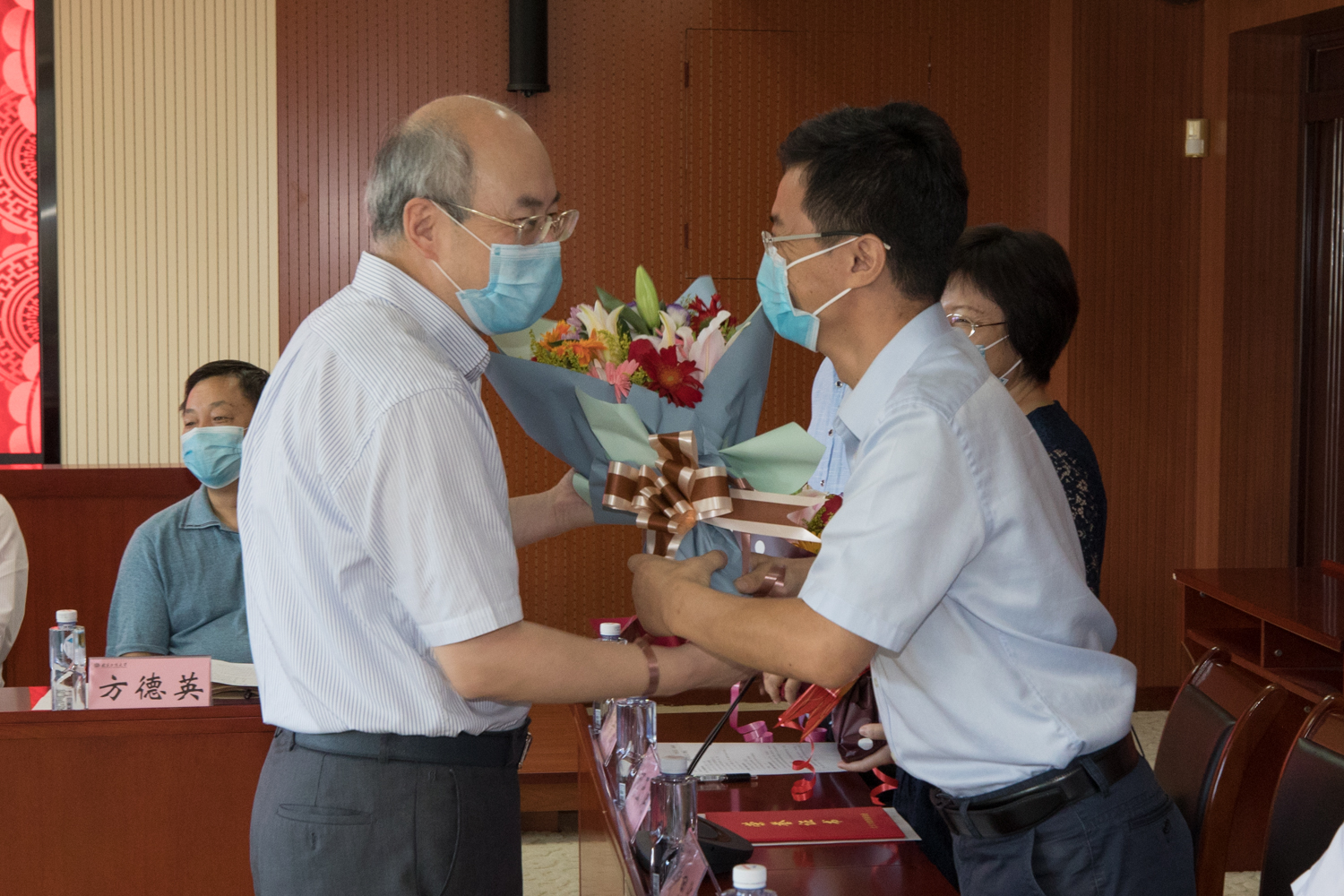 全體校領導為2020年學校從事教育工作滿30年教齡的教職工代表頒發證書。黨委書記黃先開和校長孫寶國為獲得市級以上表彰的優秀團隊和個人代表頒發證書。職能部門負責人為優秀教職工代表獻花。