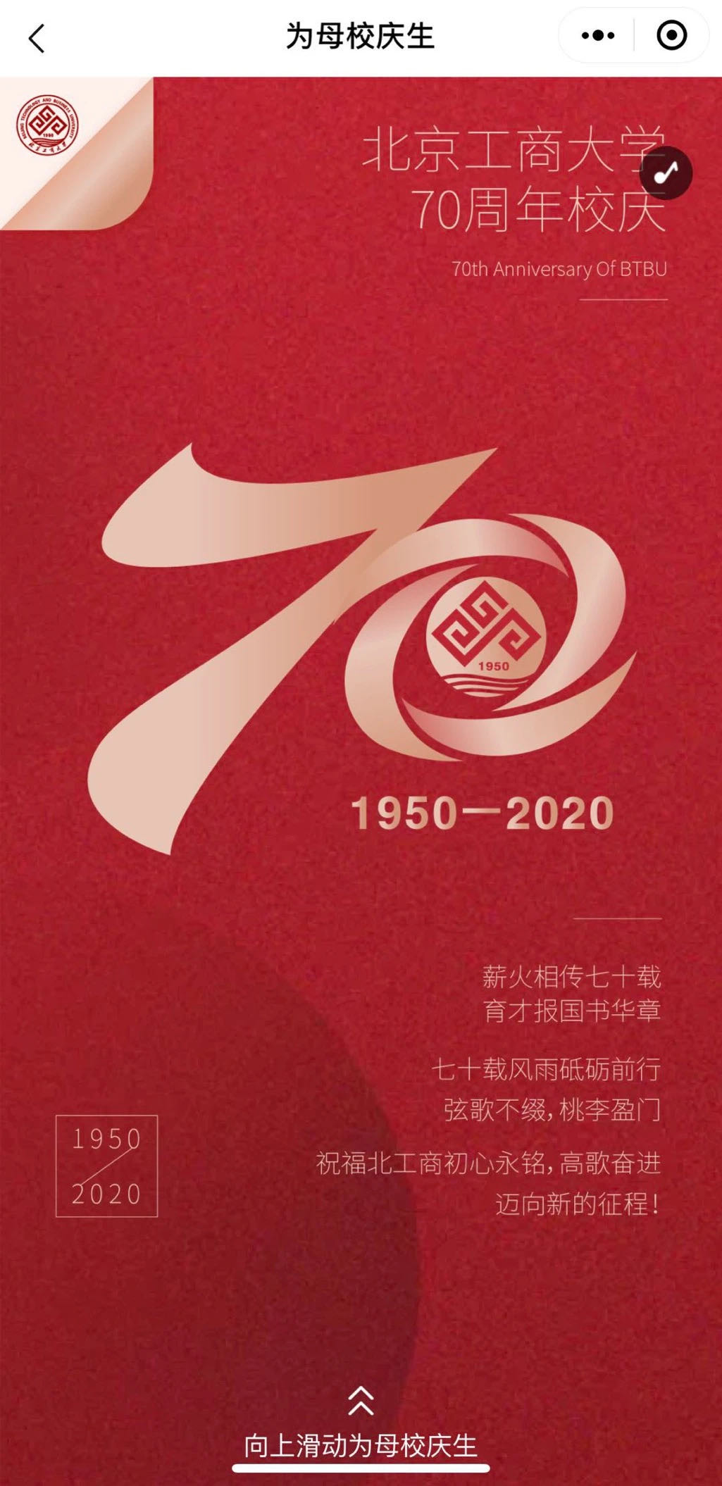 學(xué)校建校70周年校慶小程序,由黨委宣傳部、信息網(wǎng)絡(luò)中心聯(lián)合騰訊云共同研發(fā),內(nèi)含校園導(dǎo)覽(阜成路校區(qū)、良鄉(xiāng)校區(qū)全景手繪地圖)和應(yīng)用小程序(為母校慶生、點亮世界、校慶頭像框)等內(nèi)容 。