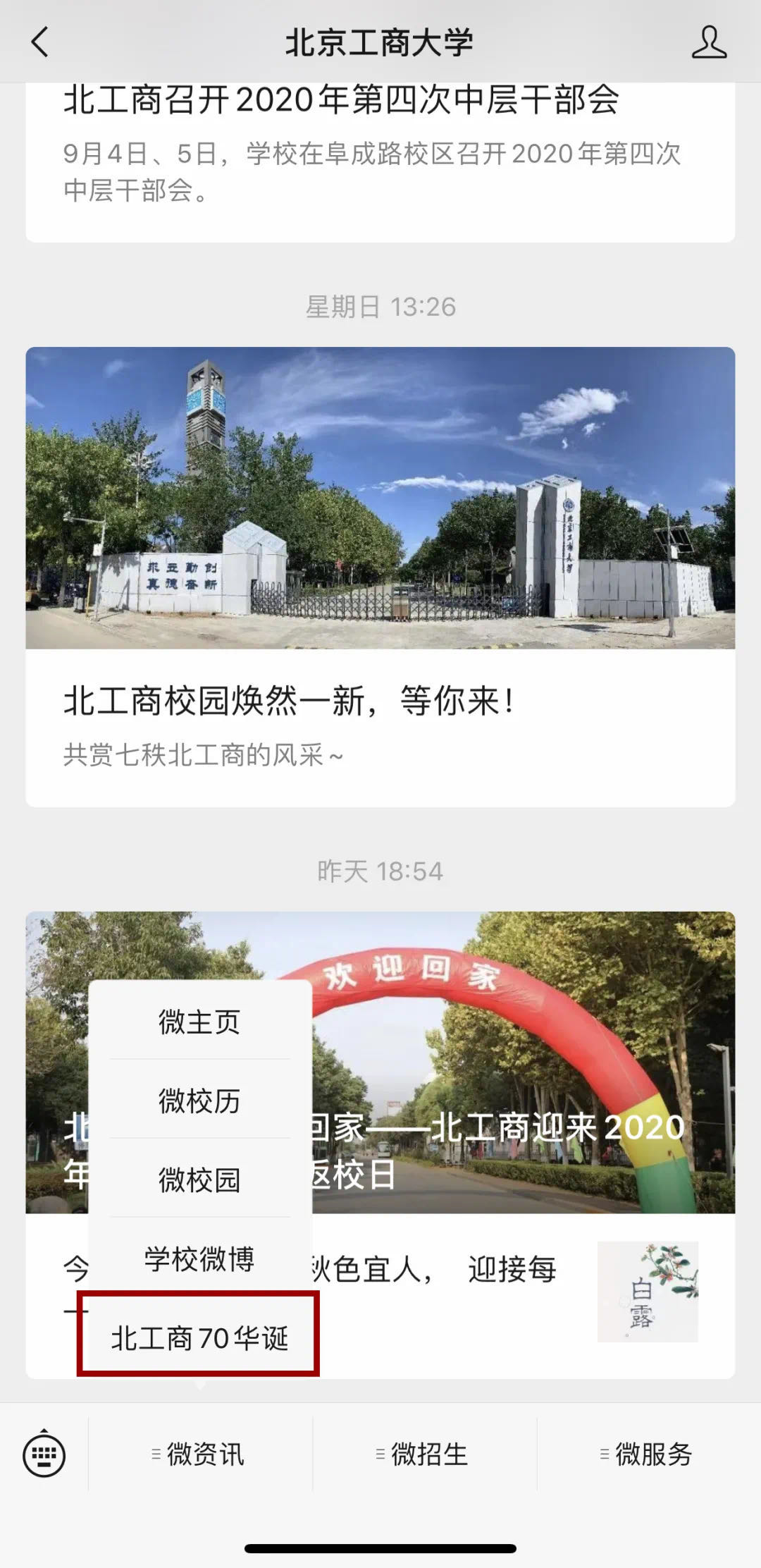 進入小程序后,分別點擊阜成路校區(qū)、良鄉(xiāng)校區(qū),進入兩校區(qū)手繪地圖頁面,繼續(xù)點擊頁面上的小便簽,可查看具體樓宇和雕塑的實景照片,也可查看簡單的介紹。掃描二維碼,進入北工商70周年小程序,自定義欄進入?;?/span>在微信中搜“北京工商大學(xué)”,進入訂閱號頁面,點擊自定義欄“微資訊”,進入“北工商70華誕”即可點開小程序。