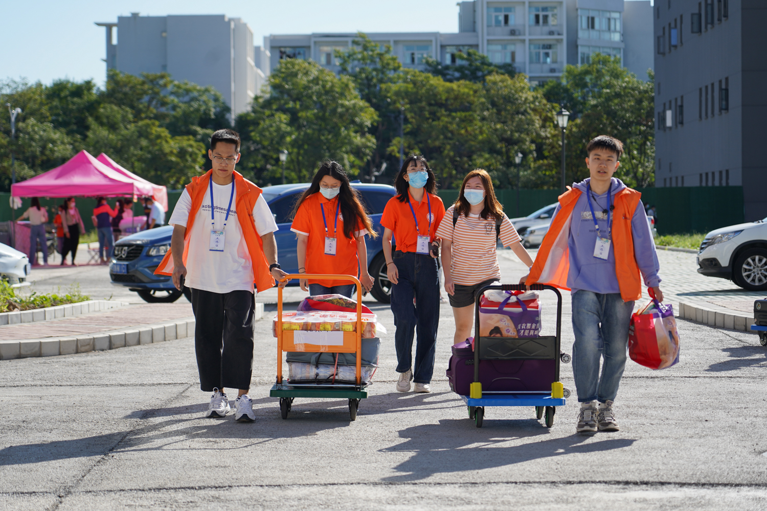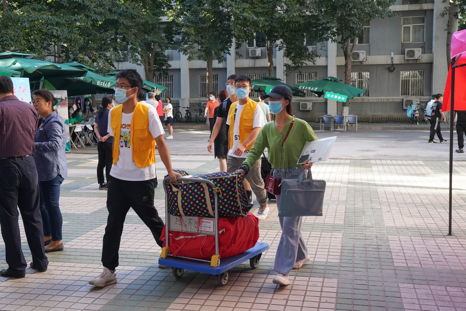 校園中,志愿者忙碌的身影引人注目,在疫情防控常態(tài)化要求下,送新生的車輛和家長親友不能入校,由在校研究生組成的志愿者團(tuán)隊(duì)肩負(fù)起護(hù)送新生報(bào)到的任務(wù),他們穿梭在校園的各個(gè)角落,幫助搬運(yùn)行李、答疑解惑,成為連接新生與學(xué)校之間的“橋梁”。