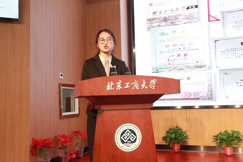 根據學科差異,答辯會分為文科組和工科組兩場,工科組候選人23名,文科組候選人37名。答辯會上,60名18、19級碩士研究生候選人按照抽簽順序,依次上場進行文稿展示。每位候選人在3分鐘的時間內,介紹了自己在學習與科研生活中的累累碩果。來自食品與健康學院的段雯,參與國家自然科學基金面上項目1項,目前以第一作者的身份發表3篇SCI,其中A2類3篇;以共同一作發表1篇SCI;以第二作者發表3篇SCI,其中A1類2篇,A2類1篇;還以第二作者身份發表1篇EI。來自經濟學院的絮美娜,獲國家級A類科研競賽,一等獎2項,二等獎1項,三等獎2項,提名獎1項,優秀論文獎1項;獲省部級B類,一等獎2項、三等獎1項;獲校級C類一等獎1項、二等獎1項、三等獎2項;以導師一作學生二作發表北大核心論文1篇,會議論文2篇;負責主持北京工商大學科研能力提升項目2項。此次答辯正值學校70周年校慶之際,在場的多位候選人都為母校獻上了祝福,紛紛表示希望為學校實現建設高水平研究型大學的目標貢獻自己的一份力量。