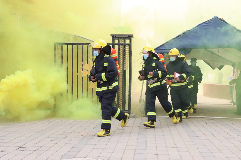 下午14時30分,演習正式開始。本次演習以8號學生公寓9單元某宿舍內電器線路故障火災為預設背景,分“發現火情、報警與接警”“人員疏散、搜救及滅火”“人員集結、清點人數”三個階段具體實施,對發生火情時學校相關部門應對處置的方法和師生逃生疏散的程序進行全過程演習。演習伊始,中控室迅速啟動防火應急預案,學校微型消防站按照“1分鐘響應,3分鐘到場”的原則進行處置,各應急小組迅速到位,安全警衛組立即對著火區域實施警戒,滅火突擊組進入火場查看火情并實施滅火,現場疏導組組織樓內學生按預定路線疏散,醫療救護組及時搶救受傷人員。在各應急小組緊密協同配合下,所有參演師生員工在5分鐘內全部疏散至指定地域,展示了學校日常消防安全宣傳培訓的良好效果。