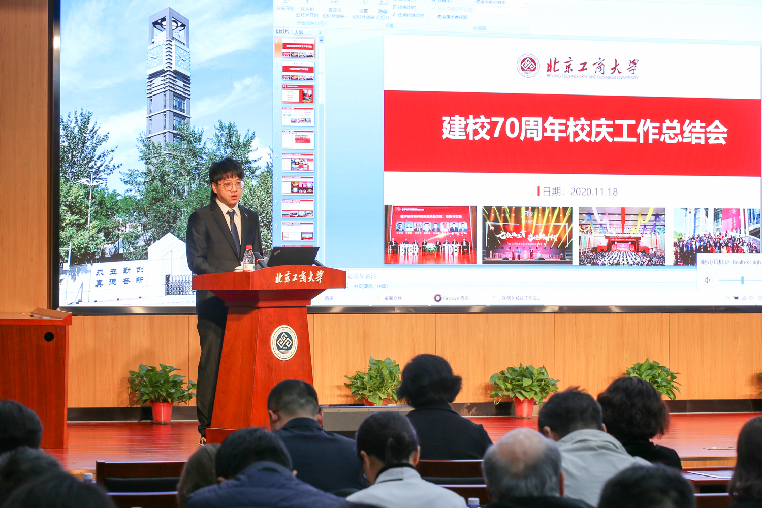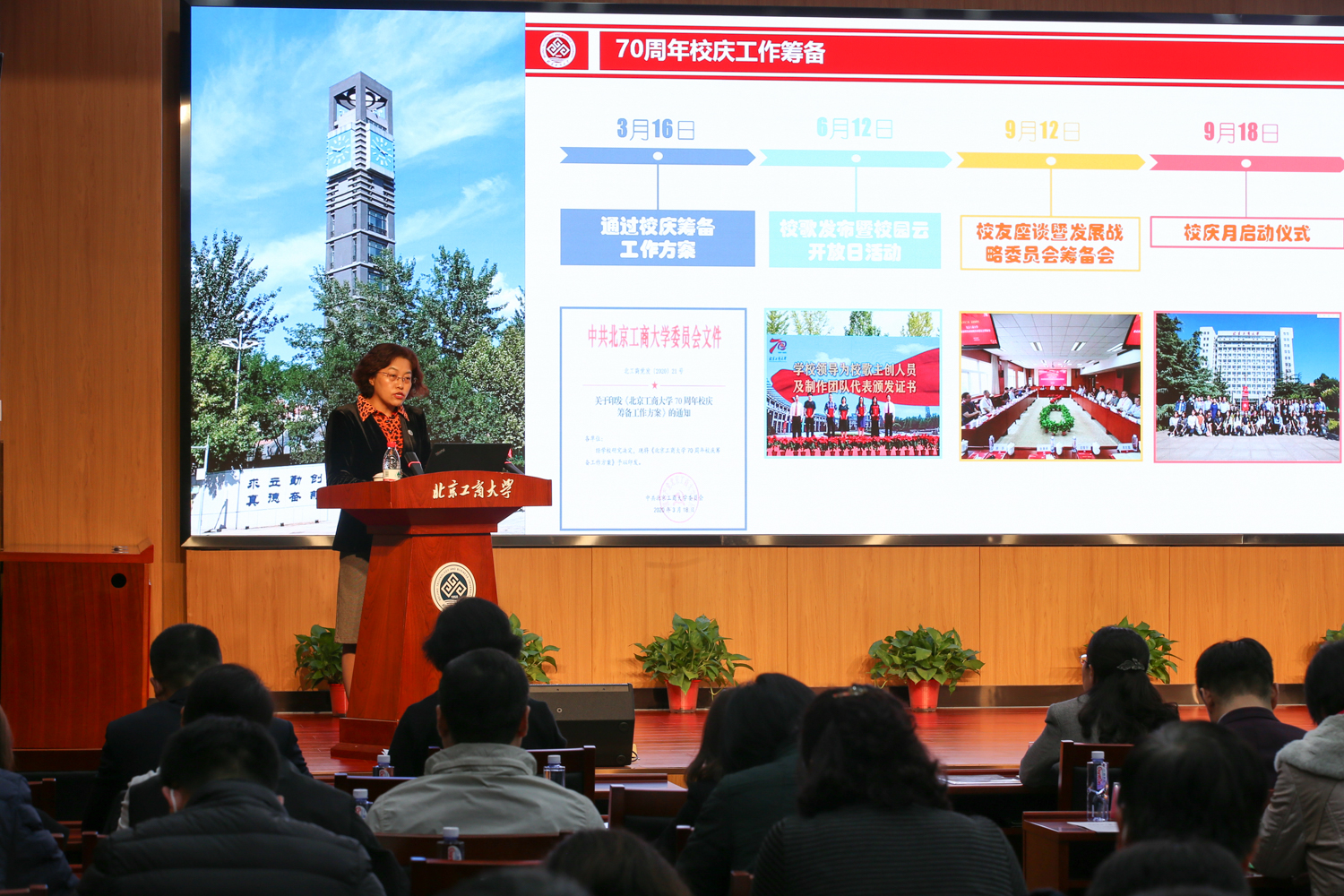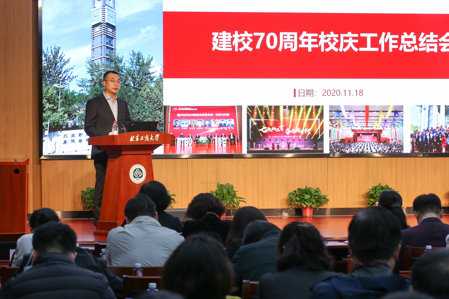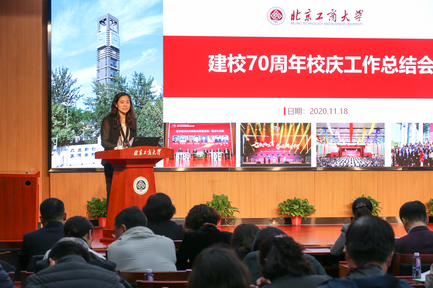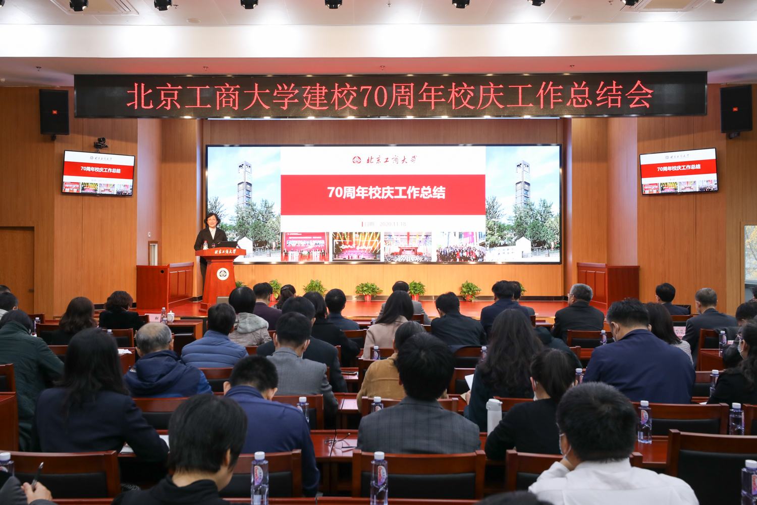 11月18日,北京工商大學70周年校慶工作總結會在阜成路校區召開。校長孫寶國,黨委副書記董竹娟,副校長張耘、鄭文紅、賈英民出席會議。學校職能部門、學院負責人,校慶嘉賓聯絡員、校慶辦工作人員、師生代表等參加了會議。會議由張耘副校長主持。