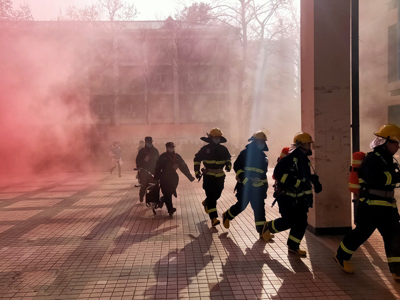 隨著學(xué)生公寓濃煙升騰,警報(bào)聲隨即響起,巡邏隊(duì)員迅速到場(chǎng)查看火情,中控室果斷啟動(dòng)火災(zāi)預(yù)案,各應(yīng)急小組迅速展開(kāi)工作。學(xué)校微型消防站立即出動(dòng),安全警衛(wèi)組立即對(duì)火災(zāi)區(qū)域?qū)嵤┚洌t(yī)療救護(hù)組跟隨微站隊(duì)員深入火場(chǎng)進(jìn)行急救,全體參演學(xué)生開(kāi)始緊急疏散。不到五分鐘,所有參演師生員工安全疏散至集結(jié)地域,“受傷”學(xué)生被安全救出,“火情”被及時(shí)撲滅,演習(xí)取得預(yù)期效果。