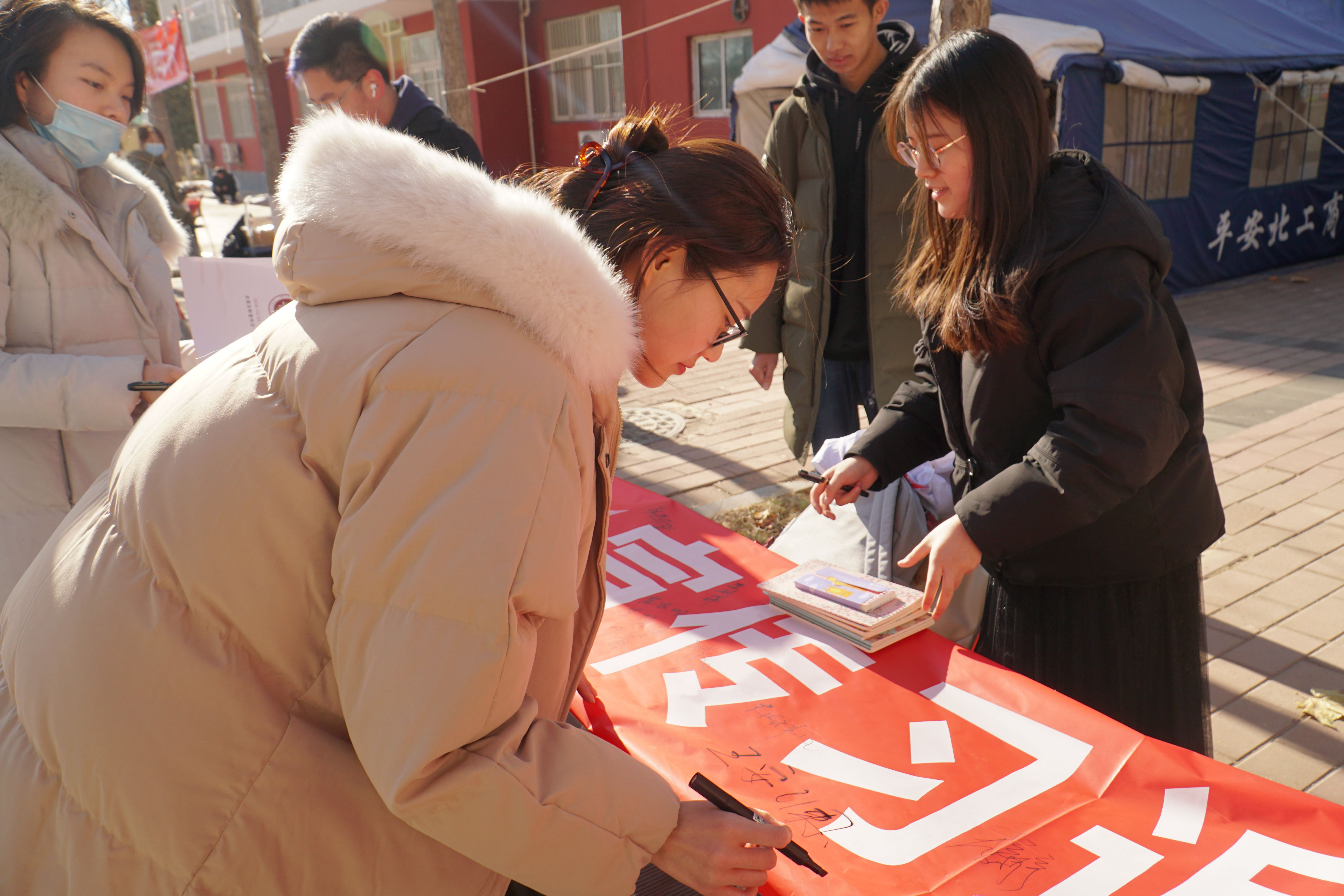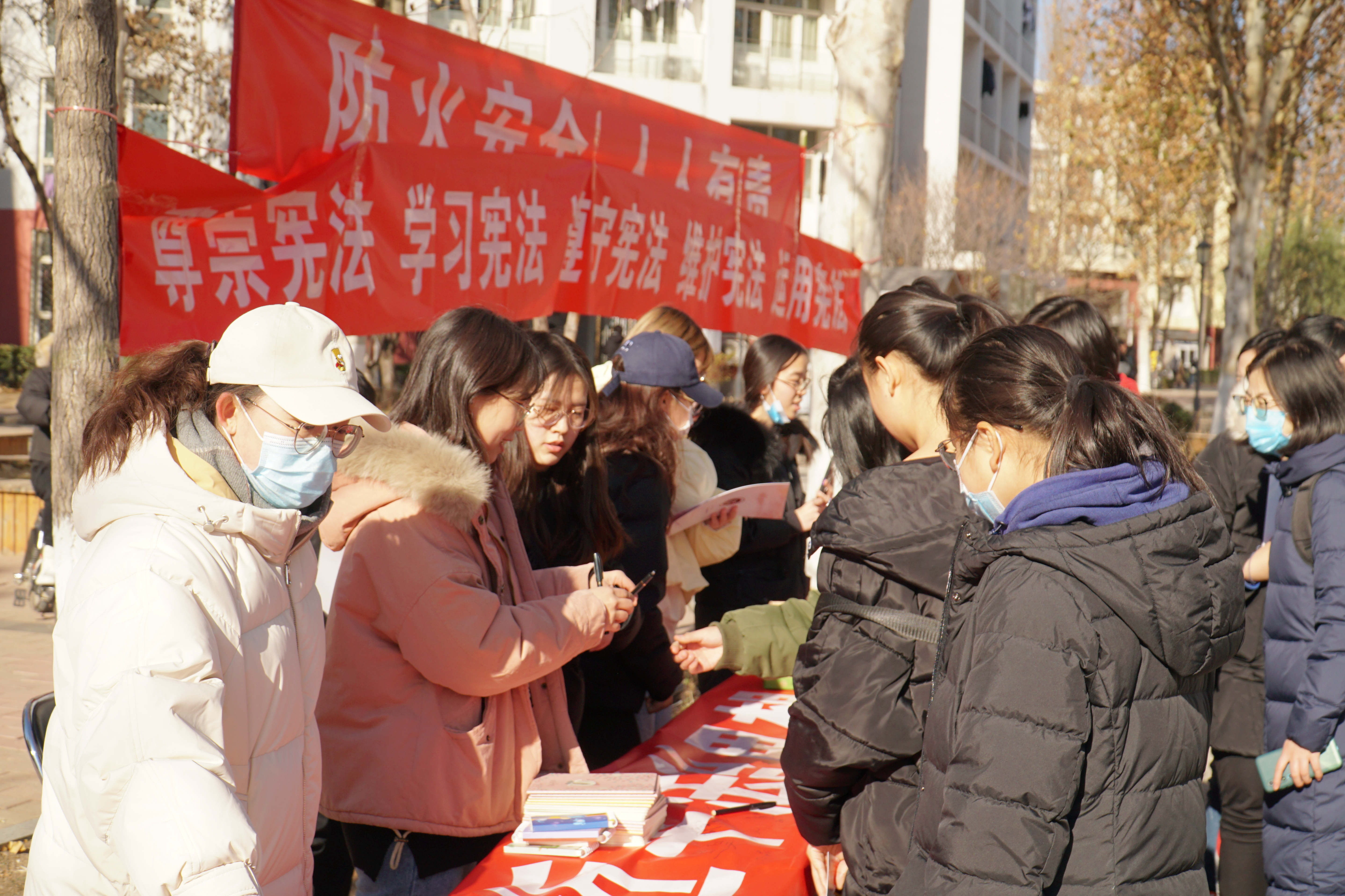 兩校區(qū)內(nèi)各處可見憲法宣傳主題展板和橫幅,法學(xué)院青年志愿者們組織了憲法知識(shí)手冊(cè)分發(fā)、憲法知識(shí)講解、趣味有獎(jiǎng)問答等活動(dòng),并號(hào)召、組織同學(xué)們?cè)趹椃ㄐ麄骱?bào)前拍照打卡,集贊兌換獎(jiǎng)品。此外,法學(xué)院教師還進(jìn)行現(xiàn)場(chǎng)法律咨詢、答疑解惑。