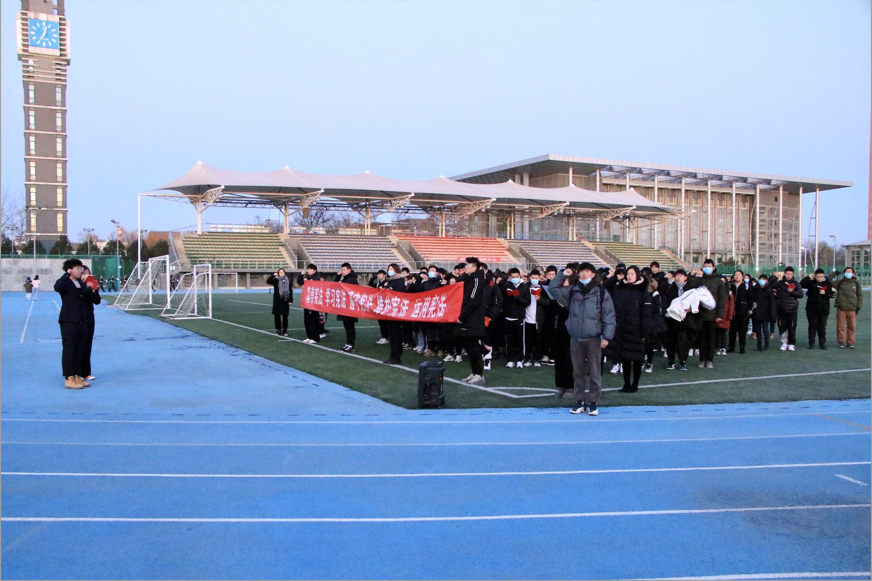 12月4日清晨,法學(xué)院組織學(xué)生在良鄉(xiāng)校區(qū)操場(chǎng)觀看升旗儀式,法學(xué)院2020級(jí)學(xué)生發(fā)表國(guó)旗下演講。同學(xué)們面向國(guó)旗進(jìn)行莊嚴(yán)、肅穆的憲法宣誓儀式。飄動(dòng)的國(guó)旗之下,大家左手捧起憲法讀本,握緊右拳舉至齊眉,用堅(jiān)定且洪亮的聲音跟誦誓詞。寒冷的冬季早晨掩不住同學(xué)們心中的火熱,對(duì)憲法的崇高敬意隨著擲地有聲的誓詞迸發(fā)出來!