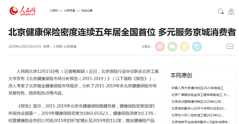 報(bào)告深入考察了北京商業(yè)健康保險(xiǎn)市場(chǎng)現(xiàn)狀,分析了2015至2019以年來北京健康保險(xiǎn)市場(chǎng)發(fā)展特色、趨勢(shì)和熱點(diǎn)等內(nèi)容。報(bào)告顯示,2015至2019年以來北京市健康保險(xiǎn)穩(wěn)健發(fā)展,健康保險(xiǎn)密度連續(xù)5年保持全國(guó)第一,2019年健康保險(xiǎn)密度為1861.65元/人,健康保險(xiǎn)深度為1.13%;經(jīng)營(yíng)健康險(xiǎn)業(yè)務(wù)的公司由2015年的87家增長(zhǎng)至2019年的112家,在售健康險(xiǎn)產(chǎn)品達(dá)5000余款,涵蓋醫(yī)療、疾病、失能收入損失、護(hù)理以及醫(yī)療意外保險(xiǎn)等五大類,逐步滿足了消費(fèi)者多層次的醫(yī)療保障需求。