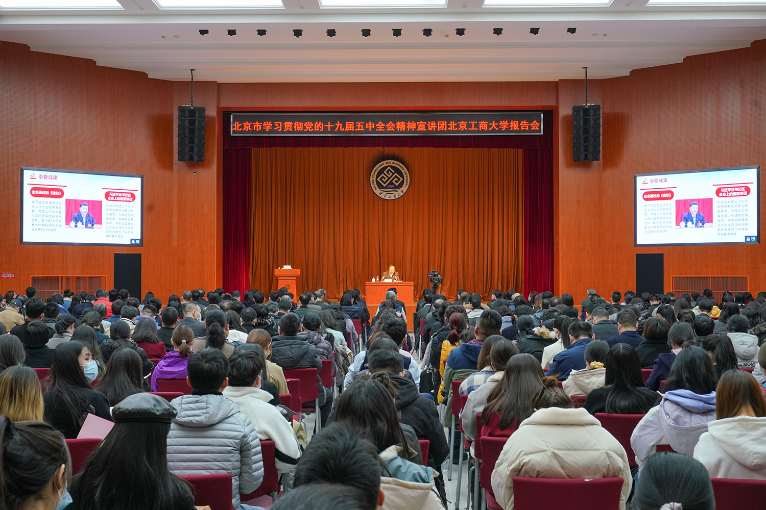 11月,北京市學習貫徹黨的十九屆五中全會精神宣講團北京工商大學報告會在我校舉行。北京市委宣講團成員、學校黨委書記黃先開作報告,全校范圍內掀起學習熱潮。學校制定《學習宣傳貫徹黨的十九屆五中全會精神實施方案》,按照“一個主題、兩大重點、四項任務、六大工程”的總體思路推動黨的十九屆五中全會精神落地生根。
