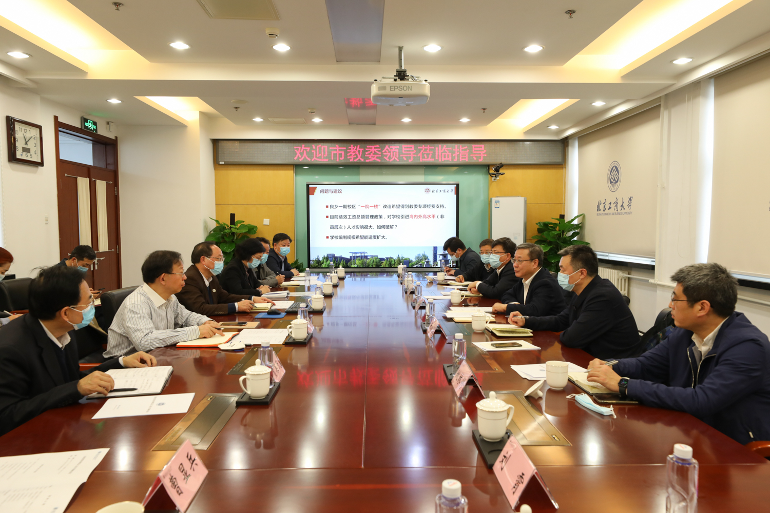市教委領導在聽取匯報后,與校領導共同研究探討了學校發展中面臨的機遇和挑戰,對重點難點問題給予了針對性的意見和建議。張永凱希望學校進一步明確辦學規模,根據社會需求調整專業布局,不斷優化辦學空間、改善辦學環境,為學校“十四五”時期事業發展做好保障。葛巨眾希望學校對接北京“四個中心”功能建設,發揮好高水平科研平臺作用,做好博士學位授權點申報工作,多舉措推進學校分類發展取得成效。