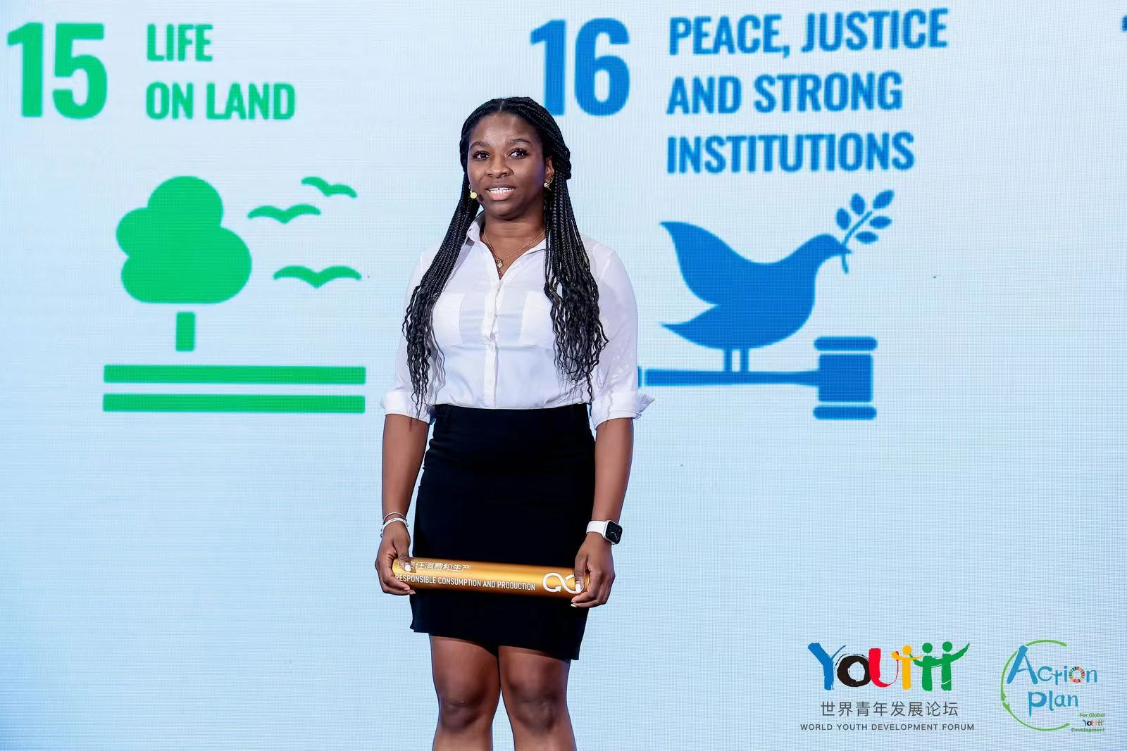 我校語言與傳播學(xué)院廣告系黃桂麗和莎娜分別點(diǎn)亮了第9項(xiàng)和第12項(xiàng)目標(biāo)。黃桂麗談到:“我來自柬埔寨,來到中國兩個(gè)月后,我發(fā)現(xiàn)強(qiáng)大的基礎(chǔ)設(shè)施是中國工業(yè)發(fā)展和創(chuàng)新的必要基礎(chǔ)。2030年,我主張支持發(fā)展中國家的本土技術(shù)開發(fā)、研究和創(chuàng)新。”莎娜倡議:“我來自來自安提瓜和巴布達(dá),已經(jīng)來到中國4年了。在2030年,我建議通過預(yù)防、減排、回收和再利用來大幅減少廢物的產(chǎn)生。”論壇最后,共青團(tuán)中央書記處書記、全國青聯(lián)負(fù)責(zé)人胡盛與17名中外青年共同點(diǎn)亮象征著聯(lián)合國可持續(xù)發(fā)展目標(biāo)的SDGs彩燈。