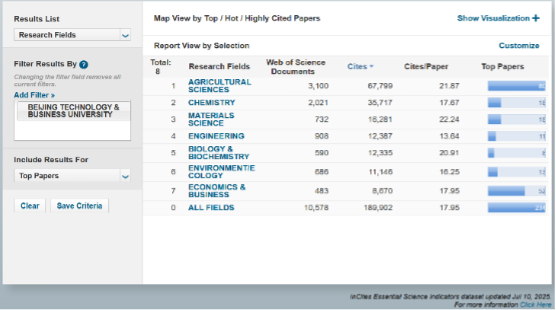 據(jù)科睿唯安(Clarivate)2025年7月發(fā)布的最新一期《基本科學(xué)指標(biāo)數(shù)據(jù)庫》(Essential Science Indicators,簡稱ESI)統(tǒng)計數(shù)據(jù)顯示,北京工商大學(xué)經(jīng)濟(jì)學(xué)與商學(xué)(Economics & Business)學(xué)科首次進(jìn)入ESI全球排名前1%,實現(xiàn)學(xué)科建設(shè)歷史性突破,標(biāo)志著我校經(jīng)濟(jì)學(xué)與商學(xué)進(jìn)入國際高水平學(xué)科行列。我校目前已進(jìn)入ESI前1%的7個學(xué)科具體表現(xiàn)如下: