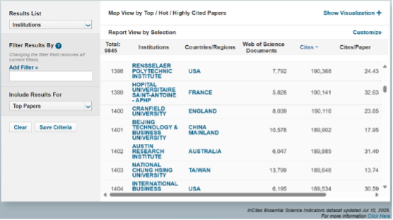 ESI數(shù)據(jù)庫共分22個學(xué)科領(lǐng)域,是基于科睿唯安Web of Science(SCIE/SSCI)所收錄的全球12000多種學(xué)術(shù)期刊的1000多萬條文獻(xiàn)記錄而建立的計量分析數(shù)據(jù)庫。以10年為1個周期對全球所有大學(xué)及科研機(jī)構(gòu)的SCI、SSCI論文及其引用情況等進(jìn)行統(tǒng)計和比較,按論文被引次數(shù)排列在前1%的學(xué)科方可進(jìn)入ESI學(xué)科排行,同時給出排名進(jìn)入全球前1%的大學(xué)及科研機(jī)構(gòu)的排序,每2個月更新公布1次。ESI數(shù)據(jù)庫通過論文數(shù)、論文被引頻次、論文篇均被引頻次、高被引論文、熱點論文和前沿論文等6大指標(biāo),從各個角度對國家/地區(qū)科研水平、機(jī)構(gòu)學(xué)術(shù)聲譽(yù)、科學(xué)家學(xué)術(shù)影響力以及期刊學(xué)術(shù)水平進(jìn)行全面衡量,已成為當(dāng)今世界范圍內(nèi)普遍用以評價高校、學(xué)術(shù)機(jī)構(gòu)、國家/地區(qū)國際學(xué)術(shù)水平及影響力的重要評價指標(biāo)工具之一。