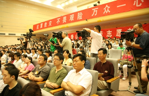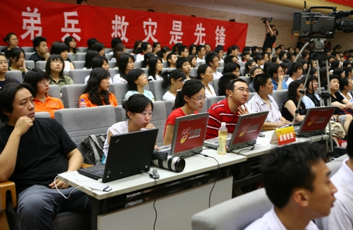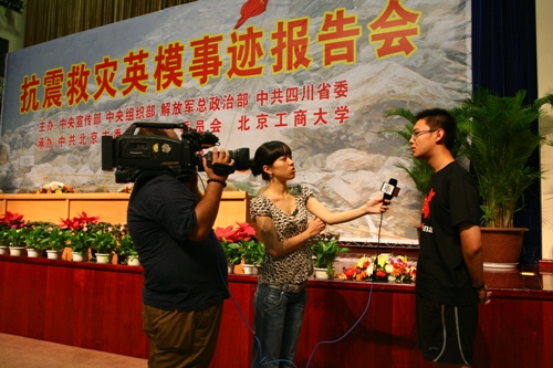6月13日,在我校舉行的抗震救災英模事跡報告會吸引了首都各大媒體前來采訪報道。今晚北京電視臺新聞一頻道6:30將播出抗震救災英模報告會新聞。