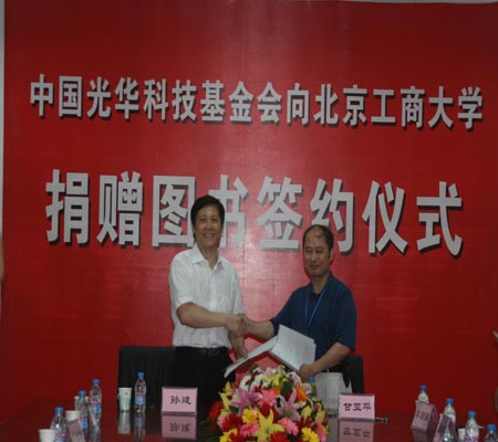 李朝鮮副校長在講話中首先對中國光華科技基金會書海工程部主任孫建一行參加簽約儀式和參觀考察北京工商大學表示熱烈歡迎,同時感謝中國光華科技基金會的善舉,感謝基金會對學校文化建設和圖書館的大力支持。圖書館將通過努力工作把捐贈的圖書管理好,幫助學校師生利用好這批捐贈的圖書,以支持學校的教學和科研,不辜負光華科技基金會對我們學校的支持和幫助。