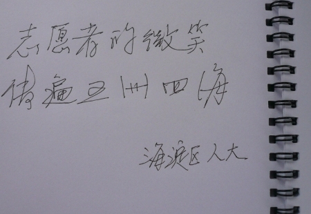珠峰火炬?zhèn)鬟f登山隊(duì)隊(duì)長王勇峰是第一名趕到服務(wù)站的志愿者。在其他志愿者的邀請下,他拿起筆在一張卡片上寫下了祝福的話語:“祝福北京奧運(yùn)成功。”并把這張卡片貼到了留言板上。隨后,其他幾名登山隊(duì)隊(duì)員也相繼趕到。幾名來自北京工商大學(xué)的奧運(yùn)志愿者爭相與他們合影留念。