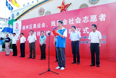 儀式由通州區團委書記張若冰同志主持。首先由通州區奧運會、殘奧會社會志愿者交通秩序維護工作小組組長、團區委副書記郭楓作工作動員,他表示:確保奧運會、殘奧會期間交通安全是當前服務奧運的一項重要任務,需要全體社會志愿者的共同努力和辛勤付出,更需要全區上下的積極參與和共同營造。隨后,嘉華學院奧運會社會志愿者代表宋錕同學宣讀了“文明出行,展現風采”倡議書。副區長趙玉影、劉淑華及與會領導為奧運會、殘奧會社會志愿者維護交通秩序服務隊授旗并為志愿者代表配發工作物資。區委副書記張文山宣布“通州區奧運會、殘奧會社會志愿者交通秩序維護崗”啟動。