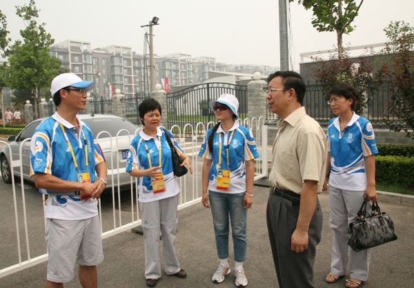隨后,孫寶國一行依次來到奧運村的三號門、四號門和一號門看望正在烈日下工作的志愿者們。當聽說志愿者們每天必須在太陽下工作8個小時左右,而這其中有半數(shù)以上是女生,孫寶國特別強調(diào)要志愿者注意保持身體健康,保障基本的飲水和休息,還特別叮囑志愿者要服用鹽水,最好不要使用藥物。在三號門,孫寶國了解到帶隊老師楊帥能夠在完成自身工作之余,與志愿者們一同在烈日下站崗,表示了由衷的贊賞。他還詢問了志愿者工作中存在的問題,并跟志愿者們說要向一起工作的交警們學習。在歡迎中心和訪客中心,志愿者們邀請孫寶國一行與大家合影留念,在了解到這些志愿者主要任務是語言服務后,他表示這是一個鍛煉自己溝通能力的好機會,希望大家能夠借此機會多向他人學習。