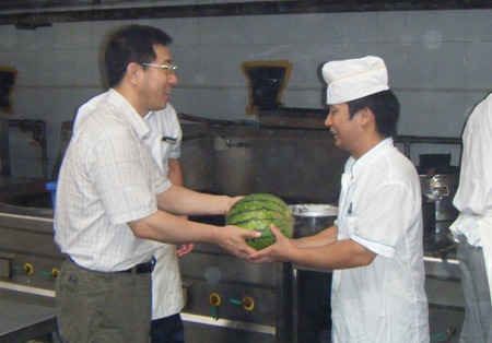 每到一地,王副校長都親切地詢問職工工作情況,叮囑大家天氣熱要注意身體,并再三囑咐后勤各部門負責人:后勤職工承擔著奧運志愿者后勤服務保障工作,任務重、工作量大,大家都很辛苦,我們一定要多關心一線工作人員,盡量為他們創造良好的工作、生活條件,使他們身心愉悅地投入到奧運后勤服務保障工作。