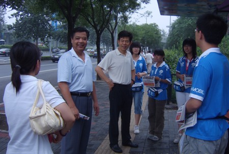 中央電視塔東倚玉淵潭,南靠北京西站,北望頤和園,是奧運期間重要的旅游景點和交通樞紐,這里人流量大,對崗位設在這里的化工學院城市志愿者的工作是一個較大的挑戰(zhàn)。城市志愿者一個很重要的工作內(nèi)容就是道路的指引,央視塔站點不時會遇到從外地來詢問路線的游客,“去玉淵潭西門怎么走?”“去鳥巢怎么坐車最方便?”“奧運專線都經(jīng)過哪里?”……志愿者們總是面帶微笑、不厭其煩地為他們講解、指路。為了方便路人,他們利用休息時間制作了奧運交通手冊、奧運場館指南、公交路線展板和央視塔周邊景點介紹展板。此外,志愿者們還想出了一個“便簽”服務的新點子。他們把路線詳細地寫在便簽上遞到問路人手里,極大的方便了行人。
