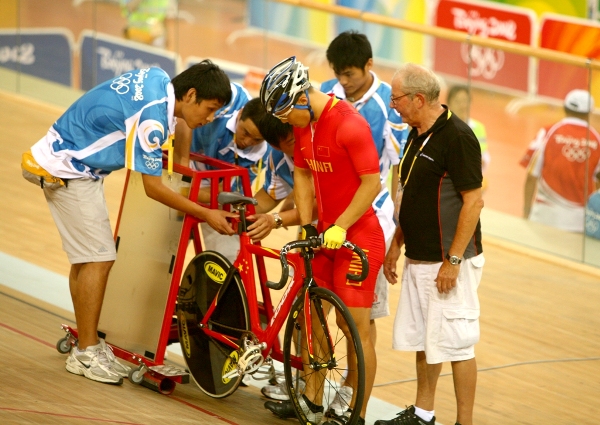 賽道上,競賽組織的志愿者在反復(fù)調(diào)試著安裝起跑器的位置。他們要將沉重的起跑器擺放在賽道的斜坡上,一人拉、一人推、一人拖電線,“放在白線上,別超過標(biāo)志的前沿。”志愿者在工作中嚴(yán)格按照起跑器的擺放要求進(jìn)行擺放,“可以用粉筆做記號(hào),減少誤差,減少對賽道的摩擦。”