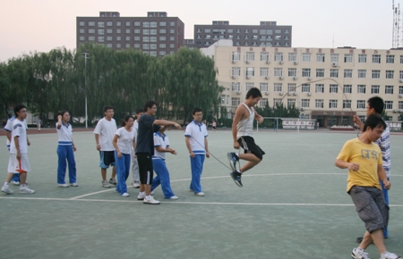 7點鐘比賽準時開始,北京工商大學(xué)一隊和物資學(xué)院一隊率先開始第一輪角逐,兩隊不約而同地選擇了循環(huán)“8”型的隊形。跑起來銜接的很緊湊,而且還省力有序,總體運行效果明顯高效。只見繩子有節(jié)律地搖動成一個均勻的弧圈,隊員們個個身手敏捷,前前后后,先后跳進跳出,男生女生配合默契,步調(diào)一致,快速而又流暢。同學(xué)們不顧一天的疲勞,下了班就跑到操場投入到磨合訓(xùn)練中。比賽中雖然有不熟練的地方而偶發(fā)失誤,但同學(xué)們早已把比賽結(jié)果跑到了九霄云外。場上場下歡騰一片,眼鏡被繩子打掉了,身體被纏住了,沒有人去在意喊疼,依然神情專注地來回穿梭;場下拉拉隊師生的歡呼聲、吶喊聲、叫好聲此起彼伏,大家臉上洋溢著微笑,一天的勞頓在這場輕松愉悅的活動中得到了充分的釋放。帶隊老師也加入其中,與同學(xué)們一道在繩間穿梭,藍色工裝和紅色工裝的搭配顯示出我們奧運村住宿服務(wù)團隊的和諧。事實證明,我們的住宿服務(wù)團隊不僅在業(yè)務(wù)上很有戰(zhàn)斗力,而且在業(yè)余文體活動中也是配合得當、協(xié)調(diào)有力。