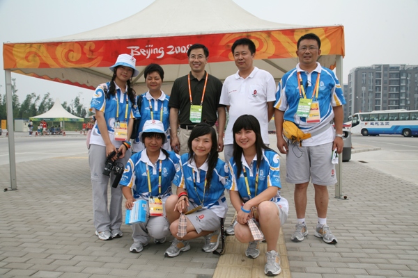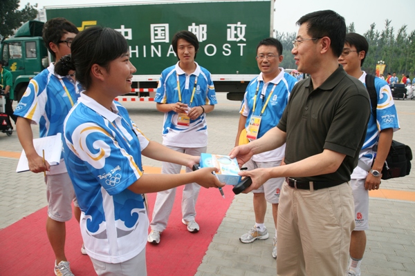 下午三點,王副校長一行到達奧運村,首先前往歡迎中心和訪客中心慰問了交通信息臺的志愿者,王副校長與志愿者們熱情握手。隨后,王副校長經過國際區(qū),在運動員班車站慰問了在崗的三名志愿者并親手將防曬霜贈與她們。當看到被太陽曬得膚色黝黑的志愿者時,王副校長親切地說:“你們辛苦了,我來的次數很少,沒法替你們站崗。”他還囑咐志愿者有什么需要盡