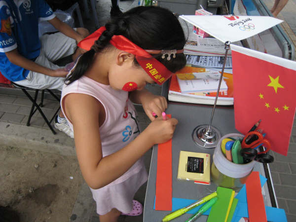 在這段服務奧運的日子里,身為志愿者的我們感受到了太多的關愛與支持!時常會有路人把自己的地圖送給我們的站點,方便我們為更多的友人服務;時常會有住在附近的朋友每天下班后都過來與我們聊天,幫我們一起解決問題;更忘不了年過7旬的老爺爺過來和我們一起唱《朋友》,也忘不了可愛的小朋友每天在公交車站等車時都來我們站點的愛心貼板上留言,還有為我們提供幫助的同學——把自己唯一一套央視國際的轉播計劃和場館地圖等送給了我們服務的站點等等等等。