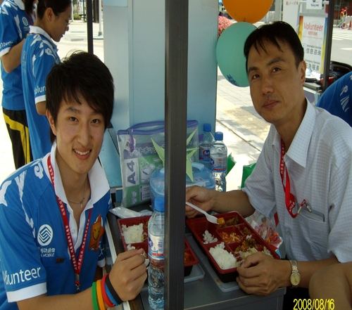 學院的領導和老師十分掛念在崗的志愿者們。計算機學院院長李文正親臨現場,頂著炎炎烈日走訪了各個站點,親切慰問了在崗的同學們,并且詢問同學們的工作情況,給予了支持與鼓勵。黨總支副書記莫倩、黨總支副書記兼副院長杜亞輝以及輔導員高山也到各個站點探望了同學們,并且指導工作,同學們細心地為老師們介紹自己站點的工作和特點,認真考慮老師們提出的寶貴意見。正趕午時,老師們不怕炎熱,與老山自行車館入口站點的同學們圍坐共進午餐。領導和老師們的關心與鼓勵為所有志愿者今后的工作給予了很大的動力。