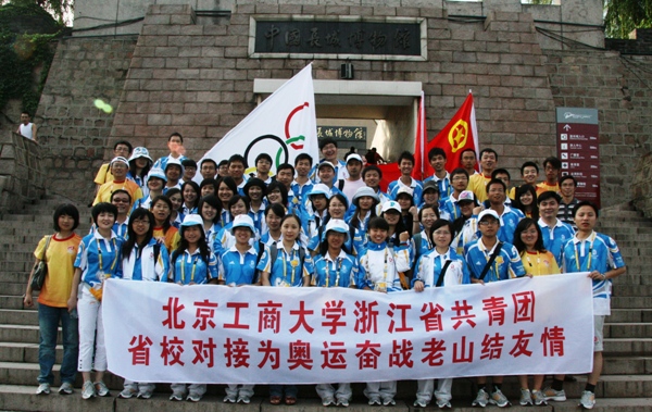 早晨6:30志愿者們坐上了開往八達(dá)嶺長(zhǎng)城的班車。身著黃色志愿者拉拉隊(duì)服裝的我校志愿者與身著志愿者服裝的浙江省賽會(huì)志愿者為古老的八達(dá)嶺長(zhǎng)城增添了新的亮點(diǎn)。期間,浙江省的賽會(huì)志愿者團(tuán)隊(duì)組織了重溫入團(tuán)儀式及“蘇楠有約”兩個(gè)活動(dòng)。在爬長(zhǎng)城的過程中大家不斷地合影留念。