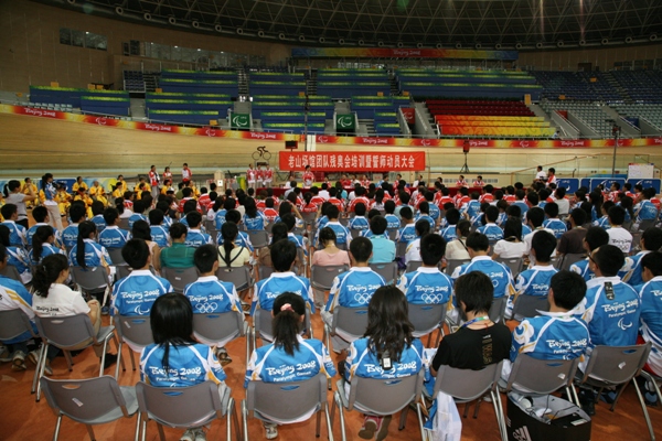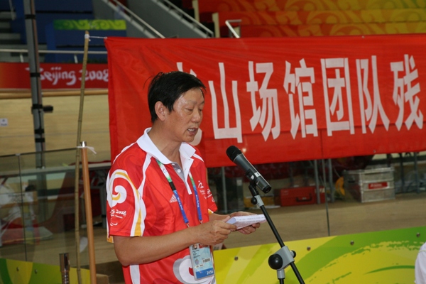 場館主任王宣慶進行了賽前動員,他要求志愿者繼續微笑服務,發揚志愿者精神、老山精神。他對工作人員及志愿者提出了幾點希望:一是要強化殘奧意識,樹立殘奧精神,維護賽事規范,積極主動地為各國運動員、殘奧大家庭成員、媒體記者及觀眾等客戶群提供高質量服務。二是要尊重殘疾人。三是要注重細節,貼心服務。培訓中,國際殘奧委會專家莫里斯通過講述,為在座的志愿者傳達了正確認識殘疾人的理念——認識殘疾人和健全人沒有價值上的區別。奧組委志愿者部綜合處副處長韓潤峰對志愿者提出希望,他說:“所有志愿者都將成為文明、和諧、進步的種子,推行殘奧會志愿者理念。”最后,奧運明星鄒振先、楊凌、高紅、樓云和節目主持人徐春妮等明星分別發言、并與志愿者互動。