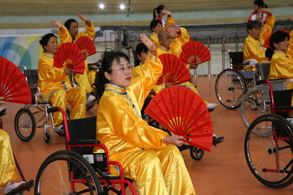 大會初始,石景山區殘聯陽光文體中心的殘疾人朋友表演了太極功夫扇和輪椅健身操,他們的表演博得了現場熱烈的掌聲。隨后,北京奧組委志愿者部副部長張巨明講話,在講話中,他代表奧組委志愿者部向為奧運會成功舉辦做出貢獻的志愿者表示了問候和感謝,他說,老山的820名志愿者將在殘奧會4天的賽事中提供服務,希望大家發揚傳統、再接再厲,共同踐行“共享微笑,共同超越”的理念。張巨明說:“希望老山的志愿者更加以人為本,用心服務,奉獻真情,同時在服務中注重細節,樹立平等、尊重、理解殘疾人的理念。殘奧志愿者會付出更多,收獲也會更多。”