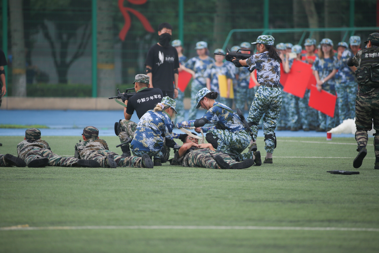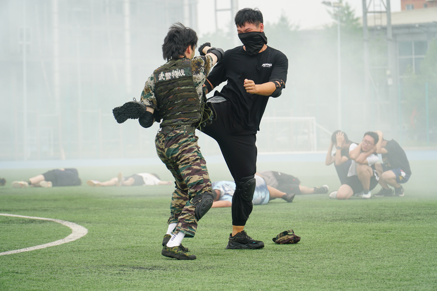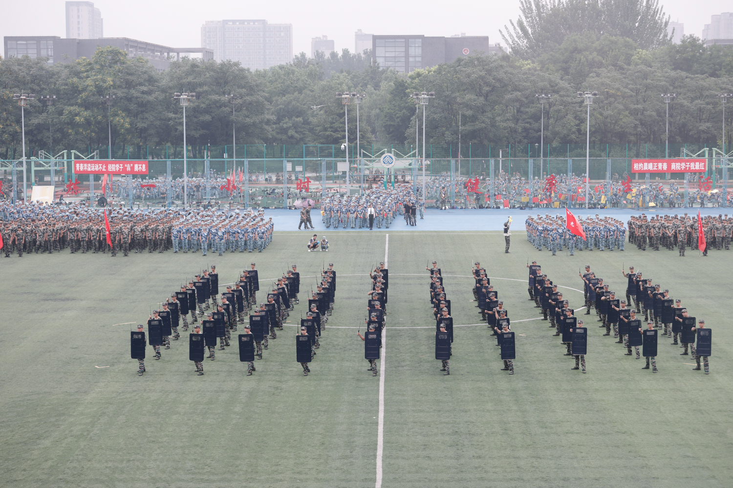 在2020級本科生軍訓成果展示中,同學們以高昂的士氣、嚴整的軍容接受檢閱。來自6個營的18個方隊踏著激昂的《中國人民解放軍進行曲》依次經過主席臺,進行分列式表演。隨后進行軍事科目表演,同學們分別進行了隊列表演、匕首操、警棍盾牌操、旗語操、擒敵拳、綜合戰術演練。同學們堅毅的眼神、鏗鏘的腳步、洪亮的口號彰顯了新時代北工商學子青春昂揚的精神風貌,贏得了在場領導和老師們的陣陣掌聲與一致好評。