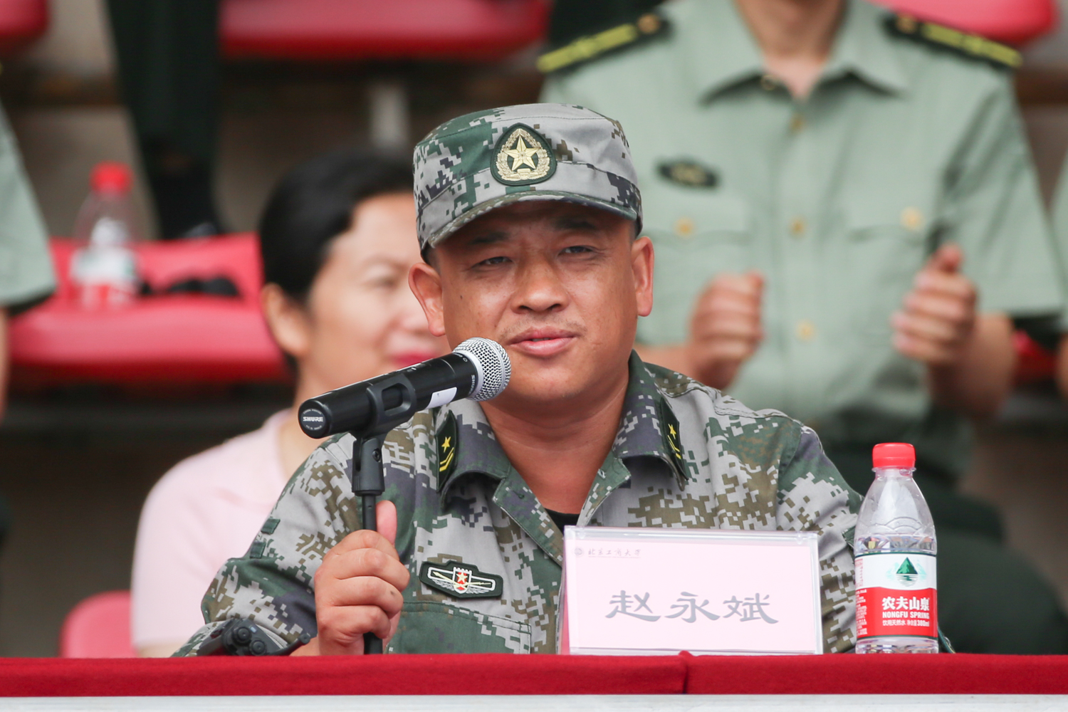軍訓團趙永斌團長作軍訓總結,他代表軍訓團全體教官誠摯地向學校領導和老師們致以崇高的敬意和衷心的感謝,向所有軍訓團的同學們表示熱烈的祝賀。本次軍訓,學校領導和教官團隊特別優化設計了訓練課目,同學們高標準完成了所有軍訓任務:隊列訓練中的堅韌、拉歌時的熱情、拉練中的剛毅、歌詠比賽時的豪邁,觀影時的愛國熱忱,聆聽報告會時的赤子情懷,完美展現了北工商青年學子的風采。他希望學子們在此次軍訓中不僅僅收獲一套技能,更希望是一次軍旅精神火炬的傳接,希望這團螢螢的火種,陪伴大家攻克學習的難題,跨越工作上的高山險峰!
