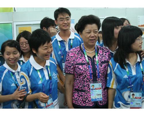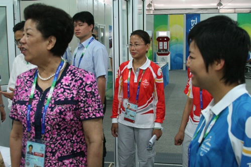 隨后,陳至立視察了分級中心運動員的各分級辦公室,并同在那里服務的志愿者們親切交談。在志愿者接待前臺,陳至立和志愿者們一一握手并親切地問候志愿者:“你們辛苦了!”同時轉達國際媒體記者對北京2008奧運志愿者的評價:北京奧運志愿者最棒!當我校帶隊老師文四英激動而自豪地向陳至立介紹分級中心的志愿者全部是北京工商大學的大學生時,陳至立高興地說:“北京工商大學,我知道,非常棒。北京工商大學的志愿者也非常棒。你們就是北京奧運會(殘奧會)所有志愿者的縮影!”