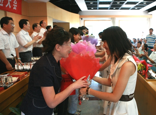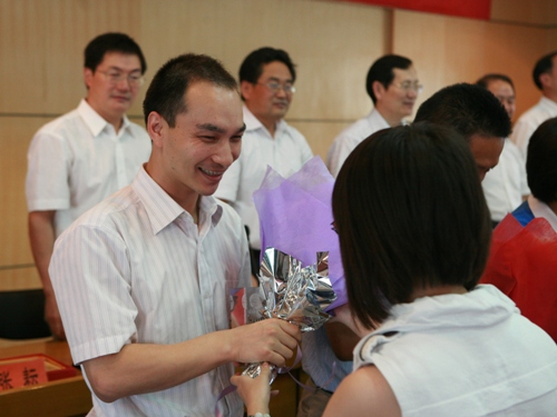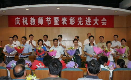 隨后,校黨委副書記盧思鋒宣讀學校表彰決定。副校長孫寶國、李朝鮮、王尚忠宣讀了我校各級先進集體、先進個人名單。副校長張耘宣讀了從教滿30年教職工名單。頒獎儀式在北京奧運會頒獎音樂中進行,獲獎者臉上的笑容與手中的鮮花相互映襯,顯得格外燦爛。音樂與掌聲交融,現場氣氛達到了高潮。