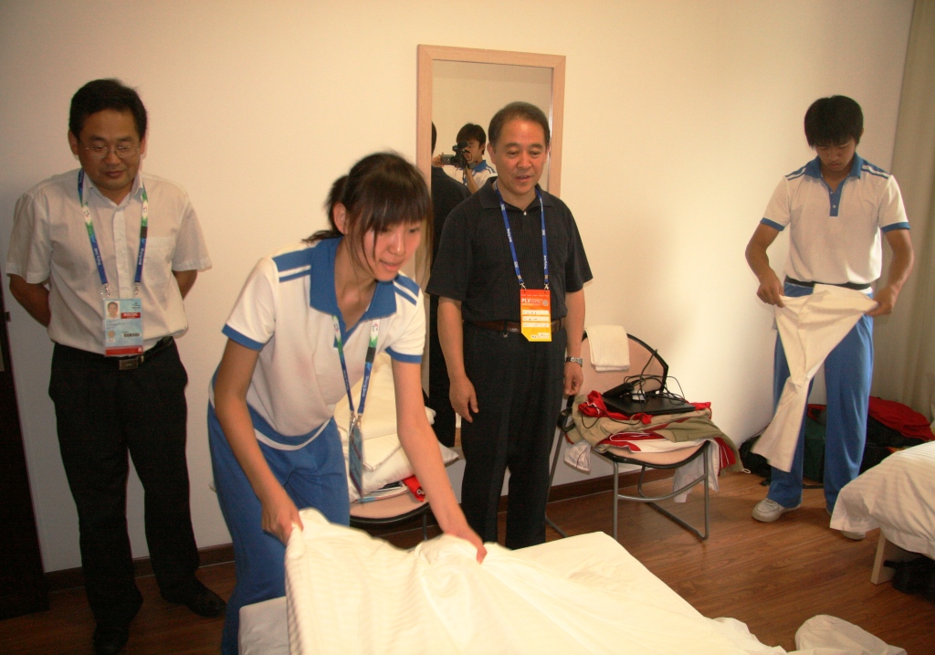 當孫堯東一行人來到我校服務生所負責的A7樓時,見到正在運動員房間做房的學生,與他們親切交談起來,他說:“你們從5月工作至今非常辛苦,學校以你們為榮。在這服務工作的最后階段,還要充分發揮肯拼搏,有朝氣的優良作風,為自己的奧運、殘奧之行畫上一個圓滿的句號!”同學們也表示,我校迎新工作昨天剛剛結束,校領導能在百忙之中抽空來看望自己感到十分欣慰和高興,同時也向領導表示,一定站好服務生最后一班崗,為學校、為祖國爭光!隨后孫堯東一行人又來到D1樓和村內各崗位看望服務生和志愿者朋友們,并與他們合影留念。