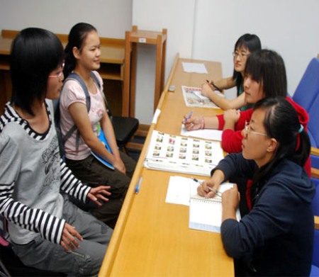 在面試現場,同學們被分成兩組有序面試。校學生記者團的老團員與前來面試的新生進行了面對面的交流。學長學姐們向他們提出了很多問題,比如“簡單介紹一下自己的愛好?”“以前做過有關心新聞方面的工作嗎?”“經常讀什么報紙嗎?”“會使用那些電視制作軟件?”等。校學生記者團還拿出了校報及許多照片讓同學們欣賞評析。參加面試新生的自信和熱情都洋溢在了臉上,現場氣氛輕松愉快。