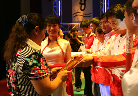 校長譚向勇代表我校向老山自行車場館、港中旅集團負責人贈送錦旗,以感謝他們在奧運期間對我校工作的大力支持。老山自行車場館群主任王宣慶也給我校贈送了錦旗,并轉交了由中共中央國務院授予我校老山自行車場館群團隊“北京奧運會殘奧會先進集體”的榮譽獎牌及證書。
