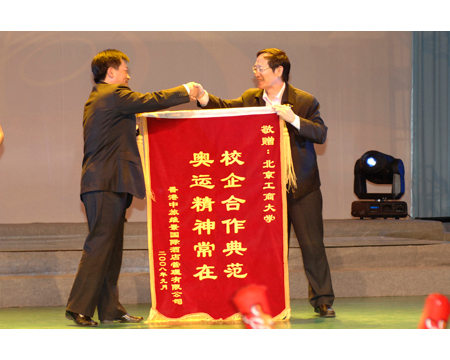 譚向勇校長(zhǎng)接受港中旅北方區(qū)副總王樹(shù)森贈(zèng)送的錦旗