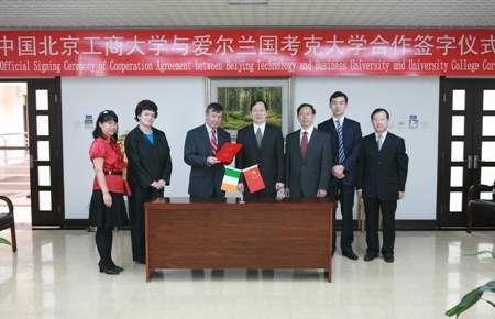 會談中,譚校長首先就邁克爾· 墨菲教授的到來表示了熱烈的歡迎,然后介紹了北京工商大學的歷史、現狀及發展規劃和回顧了兩校從2006年至今的合作歷程并高度評價了兩校合作以來取得的成就,同時對兩校全方位、多層次的深入合作提出了殷切的希望和要求。邁克爾· 墨菲校長贊同譚向勇校長對兩校合作的評價和希望,并表示愿意積極推動和加強兩校的全面深入合作。邁克爾· 墨菲校長熱情邀請譚校長在方便的時候訪問考克大學,譚校長愉快地接受了邀請。兩校今后的合作將圍繞學生培養、專業建設、學科發展向多形式、深層次發展。常設的雙學位學生項目、碩士培養項目、教師交流和培養項目,合作科研和學術會議等將廣泛惠及我校師生。通過利用國外優質教育資源,推動學校傳統專業改造,將提升我校辦學的國際化水平。