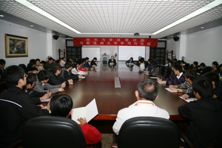 當天的行政樓307會議室內,會場氛圍格外熱烈而融洽。承載著全體大一新生的殷切期待,肩負著在新的起點上開創教學工作新局面的光榮使命,來自各個院系的08級班長、學習委員總計50余人組成的學生代表齊聚一堂;校長