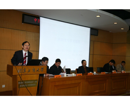 北京工商大學校長、博士生導師譚向勇教授代表工商大學對與會的專家學者表示熱烈歡迎,并作了關于“土地制度與市場組織”的學術報告.中共中央政策研究室農村經濟研究局局長潘盛洲研究員以一個宏觀經濟政策研究者的視角,為與會代表解讀中共十七屆三中全會審議通過的《中共中央關于推進農村改革發展若干重大問題的決定》.北京大學校長助理、經濟學院院長、博士生導師劉偉教授為到會老師和同學們深入分析改革開放30年后經濟的新特點。
