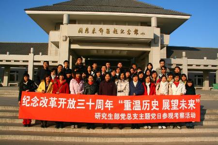 12月13日,研究生部黨總支組織了“紀念改革開放三十周年 ‘重溫歷史 展望未來’”主題黨日活動。研究生部黨總支書記董竹娟、副書記熊慧,以及其他老師和部分研究生黨員和學生干部共同組成的考察小組,開赴天津進行了為期一天的考察參觀活動??疾煨〗M先后趕往天津商業大學、周恩來鄧穎超紀念館、平津戰役紀念館等地進行了實地考察,重溫我黨輝煌歷史功績,感受改革開放巨大成果。