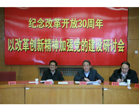 12月19日,學校黨委召開“紀念改革開放30周年,以改革創新精神加強黨的建設”研討會。黨委書記孫堯東出席并講話。黨委職能部門負責人、各黨總支、直屬黨支部書記和副書記、基層黨支部書記代表等30多人參加了研討會。會議由學校黨委副書記兼紀委書記張德玉主持。
