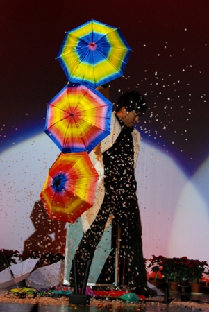 燈光變暗,舞臺中央一把把飛舞的小傘猶如一個個輕盈的精靈,將我們引入魔幻的世界.魔術的神秘與精彩隨著表演者靈活的手指展現在觀眾面前.絢麗的彩綢﹑繁雜的撲克與一把把張開的傘面交織出魔幻的夢境,也編制出一個個活潑靈動的“傘魂”!這是自廣告08班李其倫同學帶來的精彩魔術表演《夢·傘魂》,該魔術曾獲第二屆歡樂谷國際魔術節暨首屆歡樂谷魔術大賽銀獎。這是師生表演的節目中最具專業色彩的節目,似乎預示著我校的各項工作將更加專業化。