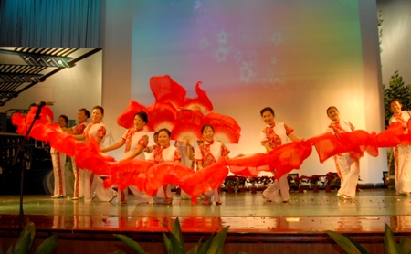 隨后,由我校退休老干部組成的,一支平均年齡為58歲的舞蹈隊為觀眾帶來了極具藏族風情的舞蹈<<吉祥謠>>。襯著布達拉宮的照片,輕靈飛揚的水袖展現出老干部們如年輕人一樣的活力與激情。她們的一招一式都顯得那么動人,那么吉祥如意。