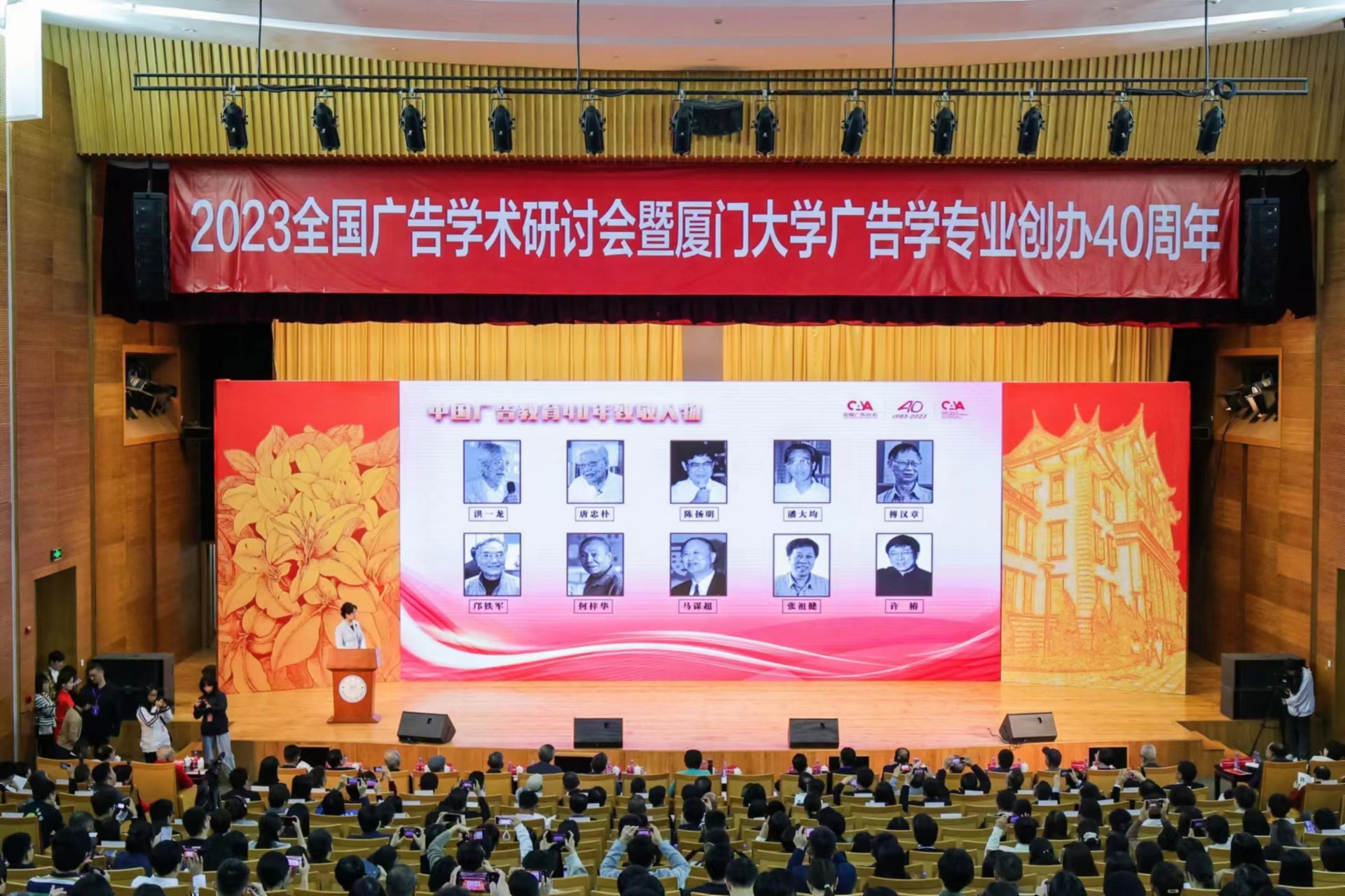 11月18日,由中國廣告協會學術與教育工作委員會聯合廈門大學新聞傳播學院共同主辦的“2023全國廣告學術研討會暨廈門大學廣告學專業創辦40周年慶”,在廈門大學科學藝術中心舉行。中國廣告協會秘書長王英偶發布“中國廣告教育40年發展光榮榜”,我校廣告學系三代學科帶頭人入選,潘大鈞教授入選“中國廣告教育40年致敬人物”,羅子明教授入選“中國廣告教育40年突出貢獻人物”,高麗華教授入選“中國廣告教育40年新銳領軍人物”。