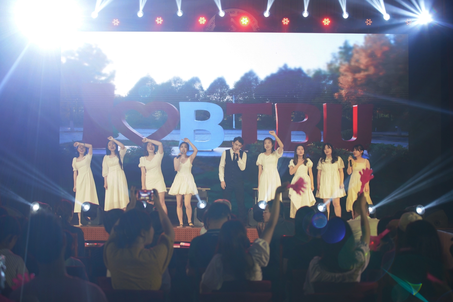 畢業晚會共分為三個篇章:“初見依然”展現研究生的精神風貌、學術追求和家國情懷,感謝同學們將最美好的青春回憶留在北工商。民樂演奏的《花好月圓》和《我的祖國》致敬祖國、獻禮建黨100周年,晚會對獲得2021年學術之星和優秀學術團隊的代表進行了表彰,感謝所有導師的默默付出;“錦瑟勿忘”以極具年代感的表演引出時代特色,通過展示在校期間的難忘時光,表達師生情、同學情,同學們與北工商是彼此最堅實的依靠;“再見工商”也作“工商畢業紀念冊”,畢業生代表們一起唱起《北京工商的日子》,表達了對母校深沉的愛,“再見”不僅僅是與學校的道別,更是多年后再次見面的約定和守候!