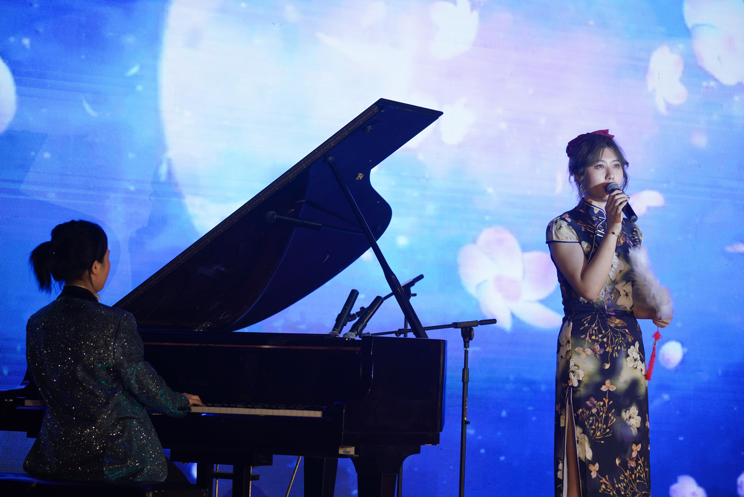 本次晚會的的特色之一就是搭建了別具創意的右側副舞臺,這個設計使整個舞臺既似水滴,又似留聲機。寓意一滴水只有融入大海才不會干涸,一個音符只有跳進一首曲子,才不會乏味,巧妙的比喻了學生與學校的關系。